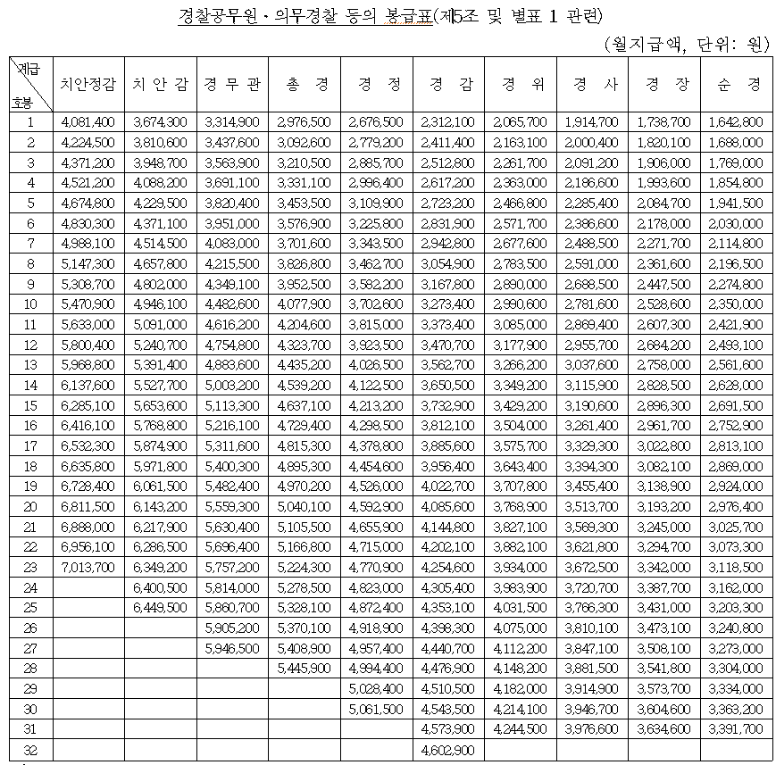 2021년 발표된 계급별 경찰 봉급표입니다. 실제 지급액은 상이할 수 있습니다.